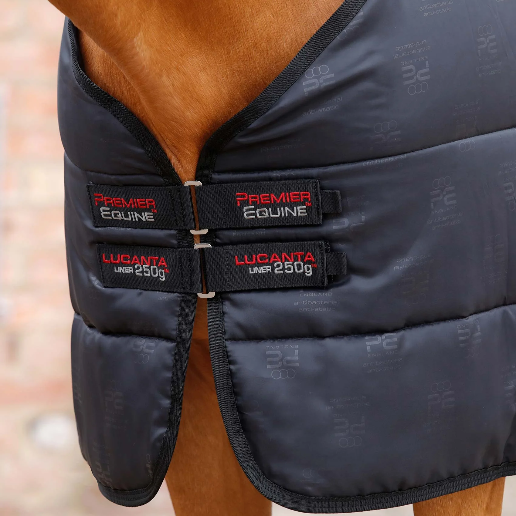 Available in 100g and 250g weights Thermo bonded fill Crafted from antibacterial and anti-static breathable polyester Forward cut neckline Channel quilted monogram design on fabric and lining Attachments compatible with Premier Equine Lucanta rug range 2 neoprene wither pads Highly breathable Double front fastening Easy to attach to outer rug Stainless steel hardware Designed to contour over the wither and rump area Your Lucanta Rug Liner comes inside a complimentary, reusable zip-fastened storage bag